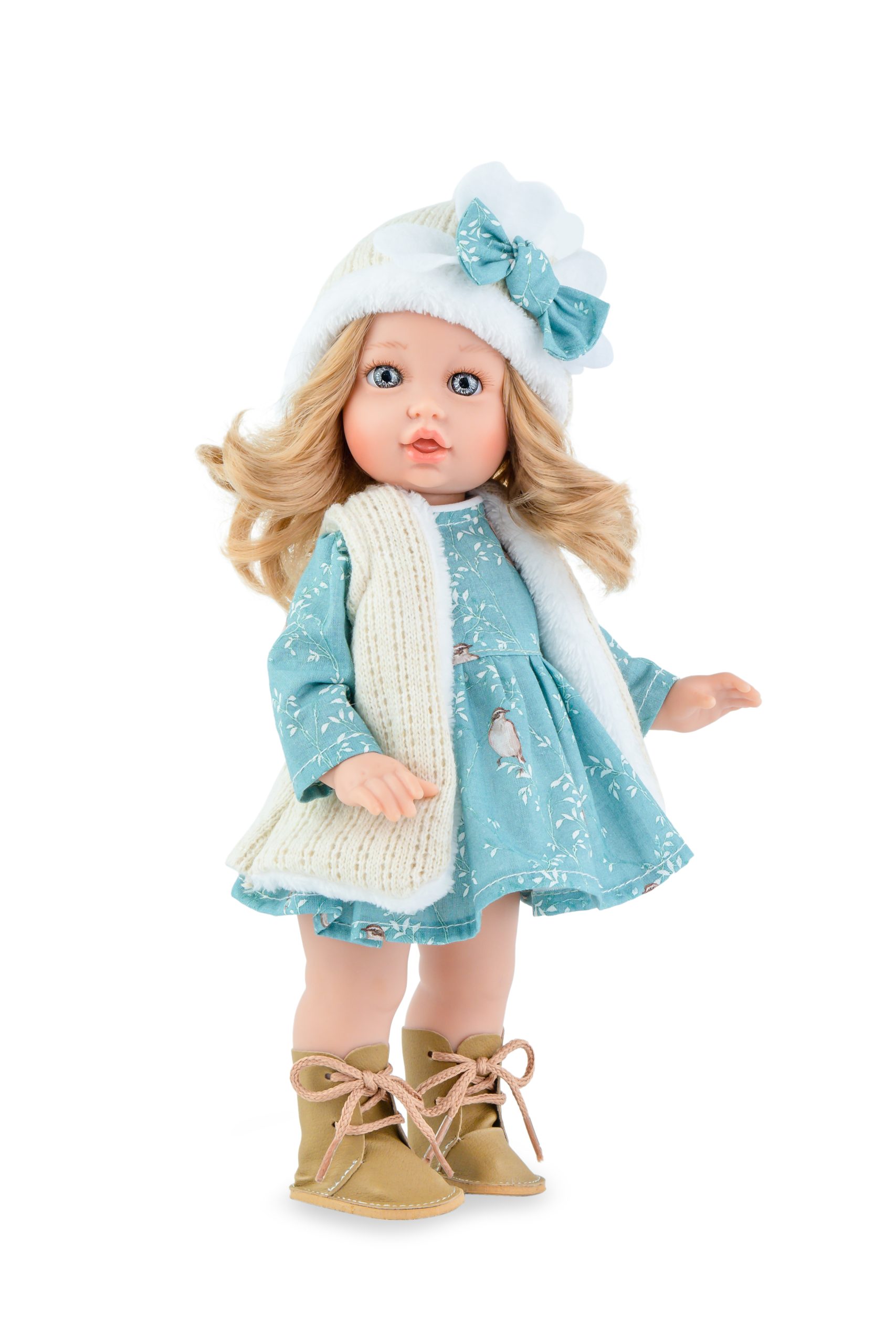 Muñeca Carol de 30 cm de la colección Petit Soleil, con un adorable conjunto invernal en tonos azules, chaleco suave y gorro a juego. Ligera, fácil de manipular y recomendada para mayores de 3 años, ideal tanto para jugar como para coleccionar.