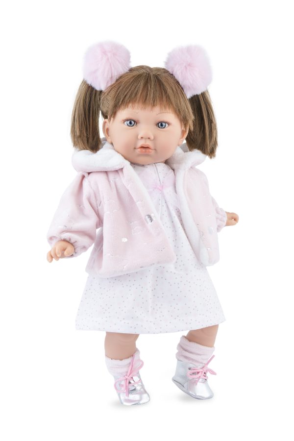 Muñeca de 45 cm. totalmente fabricada en España con materiales de gran calidad. Lleva un suave vestido estampado, chaqueta con capucha y calcetines a juego. Va peinada con dos coletas y lleva unos pompones rosa. Tiene el cuerpo blandito y huele muy bien. Presentada en estuche. Recomendada para mayores de 3 años.