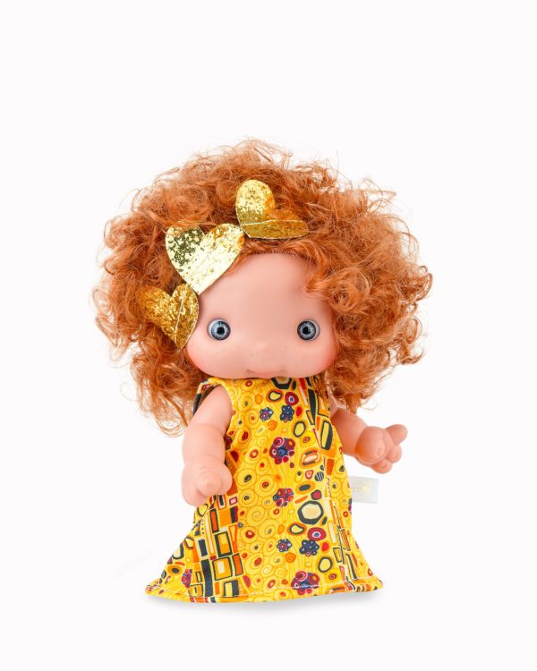 Muñeca de 25 cm totalmente fabricada en España con materiales de gran calidad. Tiene el cuerpo completamente de plástico vinil. Esta muñeca tiene un diseño inspirado en el arte de Gustav Klimt. Viste un vestido amarillo con patrones geométricos y detalles dorados, evocando la estética de pinturas como El beso. Tiene cabello rizado y pelirrojo, con un lazo dorado brillante que le da un toque elegante y artístico. Viene presentada en estuche. Recomendada para mayores de 3 años.
