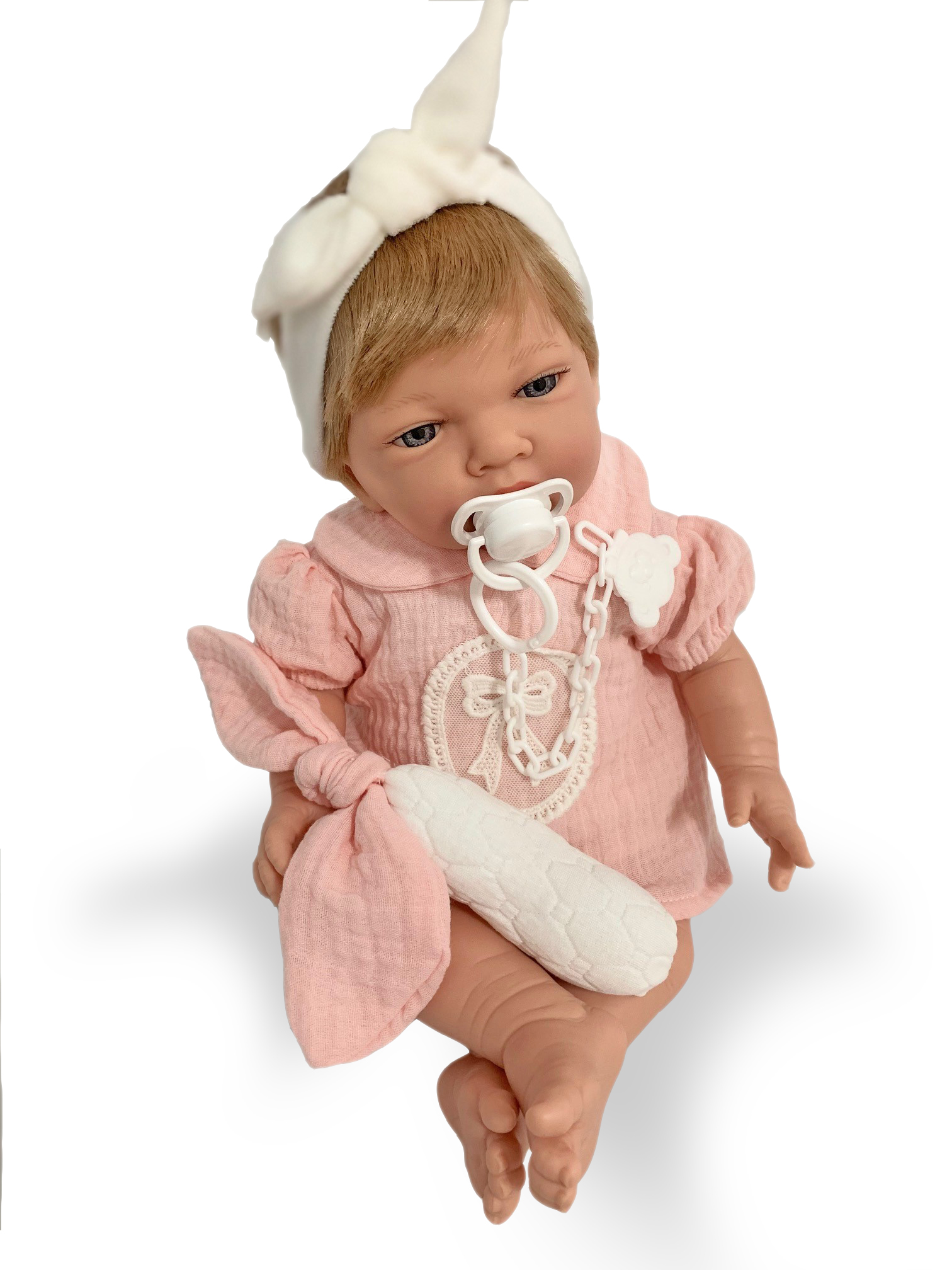 Muñeca bebé articulada de 42 cm. totalmente fabricada en España con materiales de gran calidad. Su cuerpo es blandito y su cabeza, bracitos y piernas de suave vinilo perfumado. Al ser articulada adopta posiciones de un verdadero bebé. Lleva un bonito conjunto con vestidito de color rosa con bordado delantero, braguita blanca, diadema y sonajero a juego. Incluye chupete con chupetero con clip plástico con osito. Viene presentada en un bonito estuche ideal para regalo, el cual podrás aprovechar para guardar las cositas del bebé. Recomendada para mayores de 3 años.